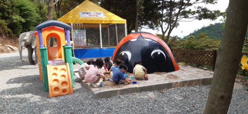 야외 놀이시설에서 즐거운 시간을 보내는 천사같은 꼬마 고객님들